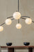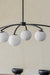 The Eos Chandelier reimagines mid-century lighting with a white marble resin body and slim black arms. Lightweight yet striking, it suits high ceilings and dining areas with timeless visual drama.