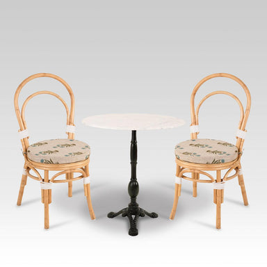 This Victorian-inspired cast iron table and Thonet Chair set creates a seamless look. The set's simplicity and adaptability allow it to be used in a variety of settings.